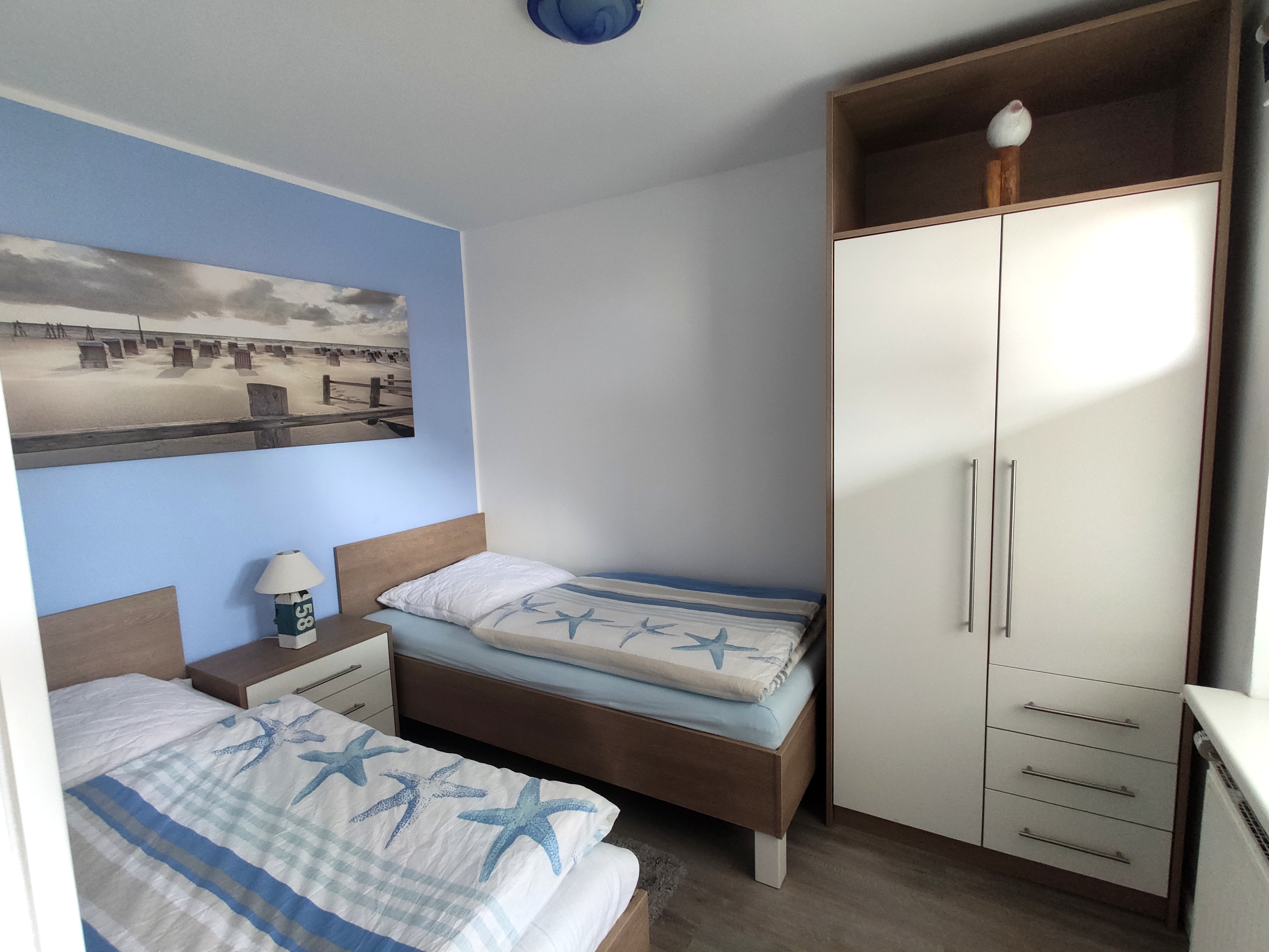 Für erholsamen Schlaf sorgen bequeme Einzelbetten sowie ein hochwertiges Schlafsofa im Wohnzimmer, das zusätzlichen Komfort bietet. Das zeitgemäß gestaltete Bad rundet das Wohlfühlangebot ab.
